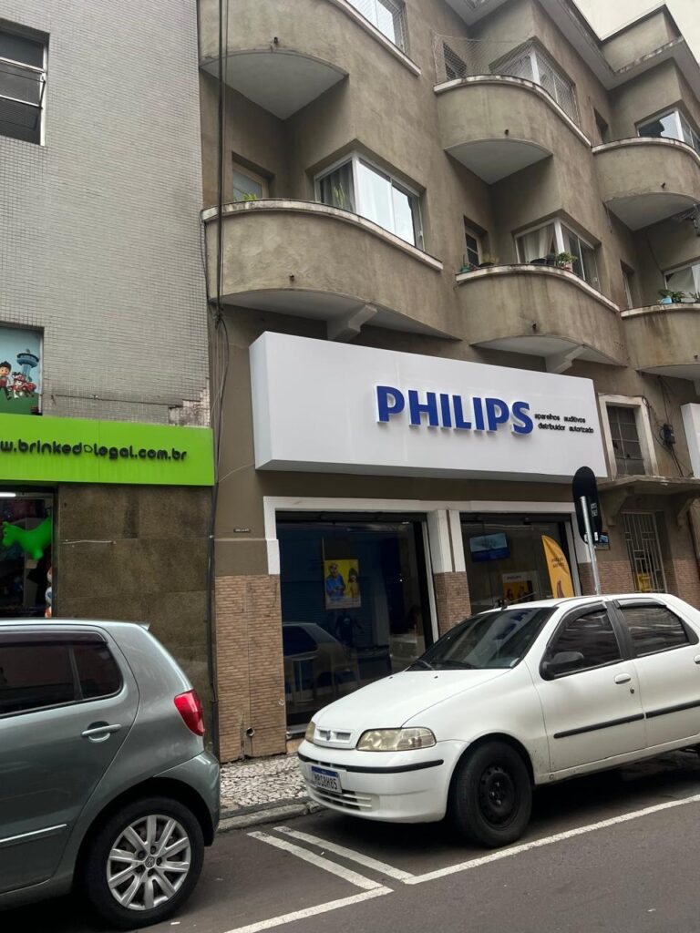 Primeiramente, o projeto da fachada considera o layout do espaço e a identidade visual da Philips. Cores, recortes e proporções seguem o padrão da marca. Dessa forma, a fachada se integra ao ambiente urbano e mantém uma comunicação visual clara e organizada. Ao mesmo tempo, o ACM permite um acabamento preciso e uniforme.