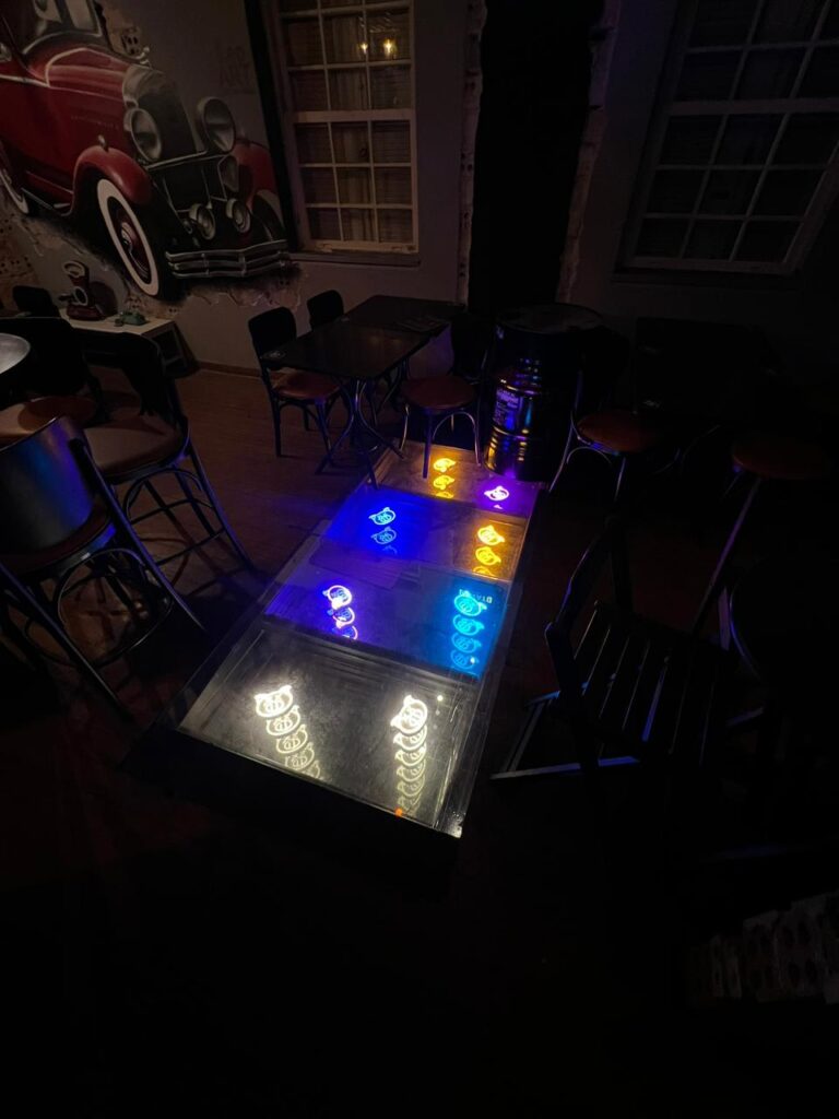 Dessa forma, o ambiente do pub ganhou um ponto de atração que se destaca em qualquer iluminação. Um Infinity Mirror bem projetado funciona tanto como um elemento decorativo quanto como uma ferramenta de imersão. Consequentemente, o projeto estimula a interação dos clientes com o espaço. Portanto, o resultado une a diversão clássica de um pub com a arte e a inovação tecnológica.