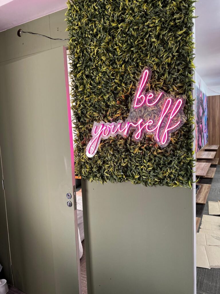 Outro diferencial do LED neon Be Yourself é o impacto emocional da mensagem. Além de decorar, o neon comunica valores, criando conexão com quem frequenta o espaço.
