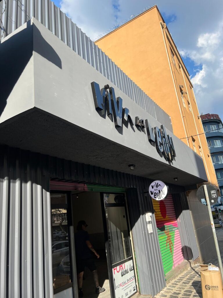 Outro diferencial da letra caixa Viva La Vegan é a clareza na leitura e o reforço da identidade da marca. O efeito da luz indireta destaca o nome sem ofuscar, mantendo harmonia com o ambiente urbano.