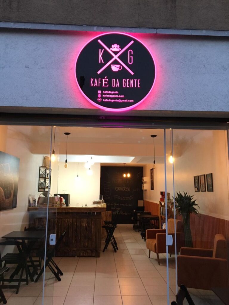Por esse motivo, o letreiro se destaca sem exageros. Além do mais, ele se integra facilmente à decoração do ambiente, reforçando a identidade visual do Kafé da Gente de forma harmônica.
