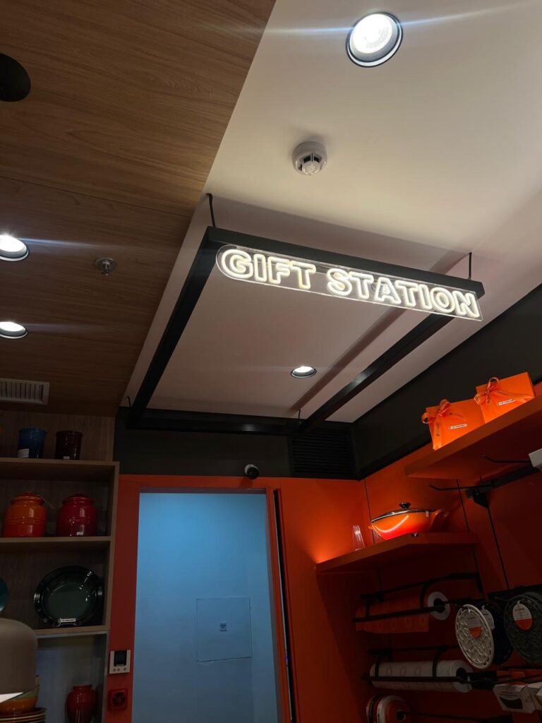 Para marcas que buscam uma identidade visual marcante e moderna, a combinação de materiais é o grande segredo. Recentemente, nossa equipe desenvolveu um projeto exclusivo: um letreiro suspenso em metalon com face em LED Neon. Dessa maneira, unimos a força do aço com a leveza da luz, criando uma peça que flutua no ambiente e atrai todos os olhares. Além disso, o formato quadrado da estrutura garante uma simetria perfeita para instalações centrais em lojas, recepções ou estúdios.