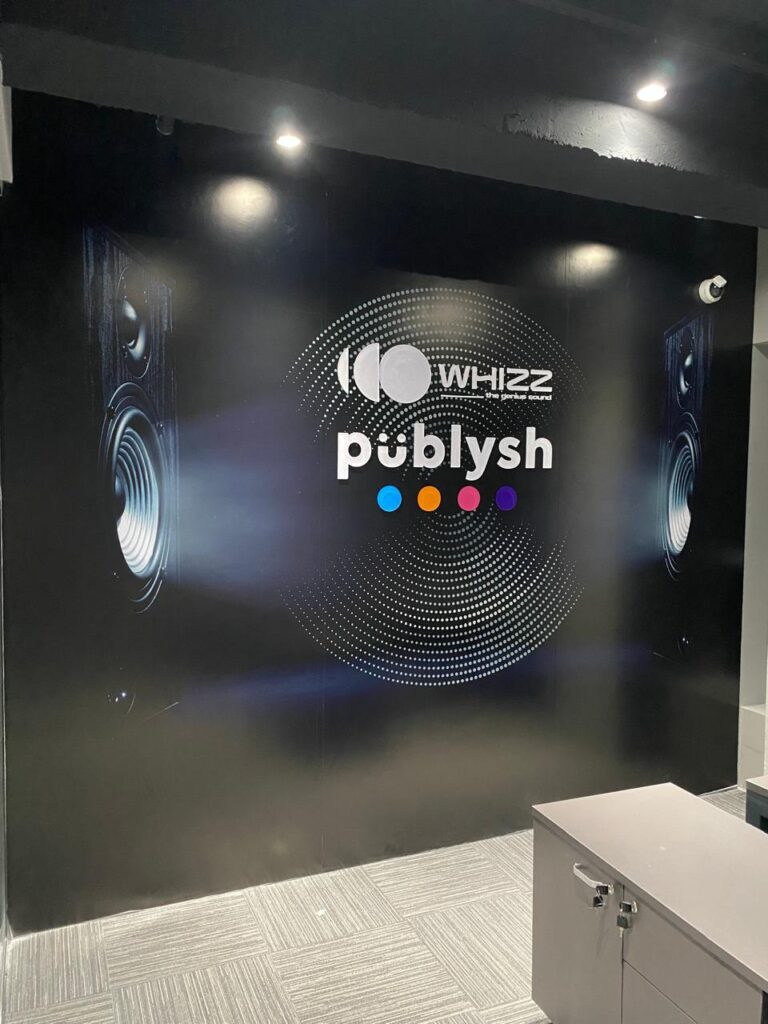 As logos em acrílico da Whizz e da Püblish foram produzidas com acabamento preciso, garantindo leitura clara e presença visual forte. A plotagem de parede corporativa, quando combinada com acrílico, resulta em um visual moderno e bem definido.